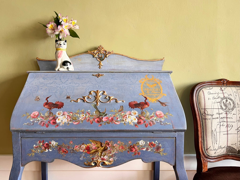 Designed with both small décor and furniture scale in mind, Madeleine includes corners, borders, drawer-backer motifs, and full bouquets that can stand alone as focal elements. Many of the arrangements come directly from the antique artwork exactly as they were found, offering lavish compositions that feel feminine, expressive, and beautifully over the top. Whether placed on a tray, a chest of drawers, or a curated vignette, Madeleine captures the indulgent beauty of historic French interiors in a way that invites bold, elegant creations.